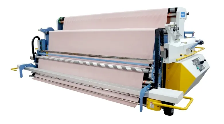 相對(duì)于滾筒布斗,V布斗能輸送彈性面料、易變形面料、易散開面料等;后端電動(dòng)下降和抬起,方便上布,后端抬起高度可以調(diào)節(jié),能防止不圓卷布滾動(dòng)時(shí)掉出。能放的卷布外徑更大,直徑達(dá)到1米;切換到匹布斗模式,適應(yīng)布料形態(tài)多樣性可放1.2米大匹布。